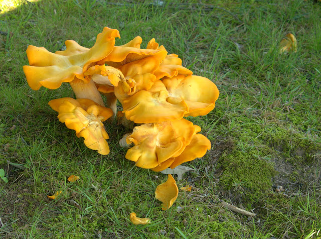 huge orange mushrooms. Some of them growing at the base of oak, part are