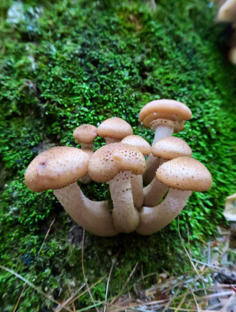 Using pictures from the book "A Field Guide to Mushrooms of th Carolinas" I recognized several mushrooms that could be on the trail: Honey Mushrooms, Crossveind Troop Mushrooms, Scaly Pholiota ...